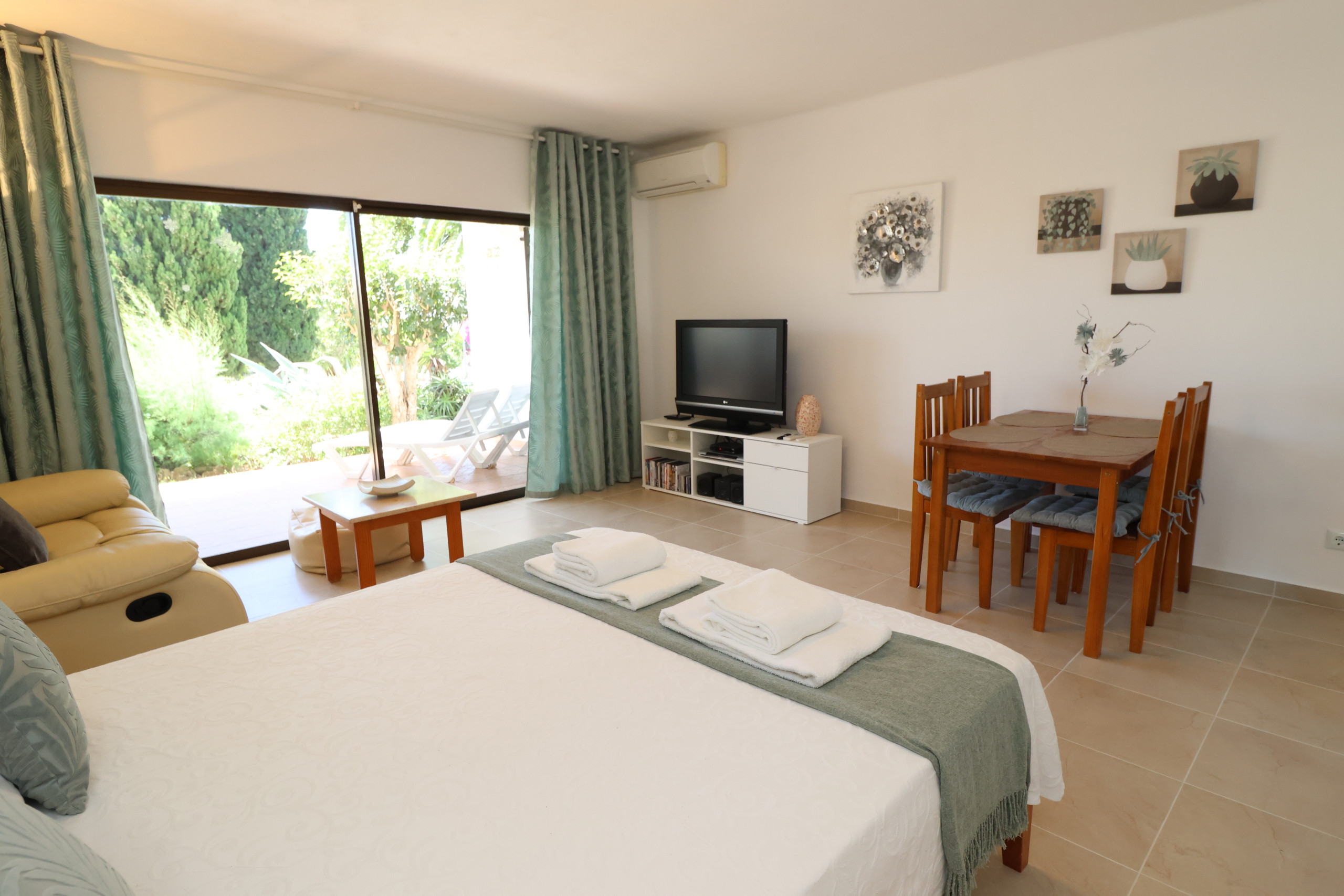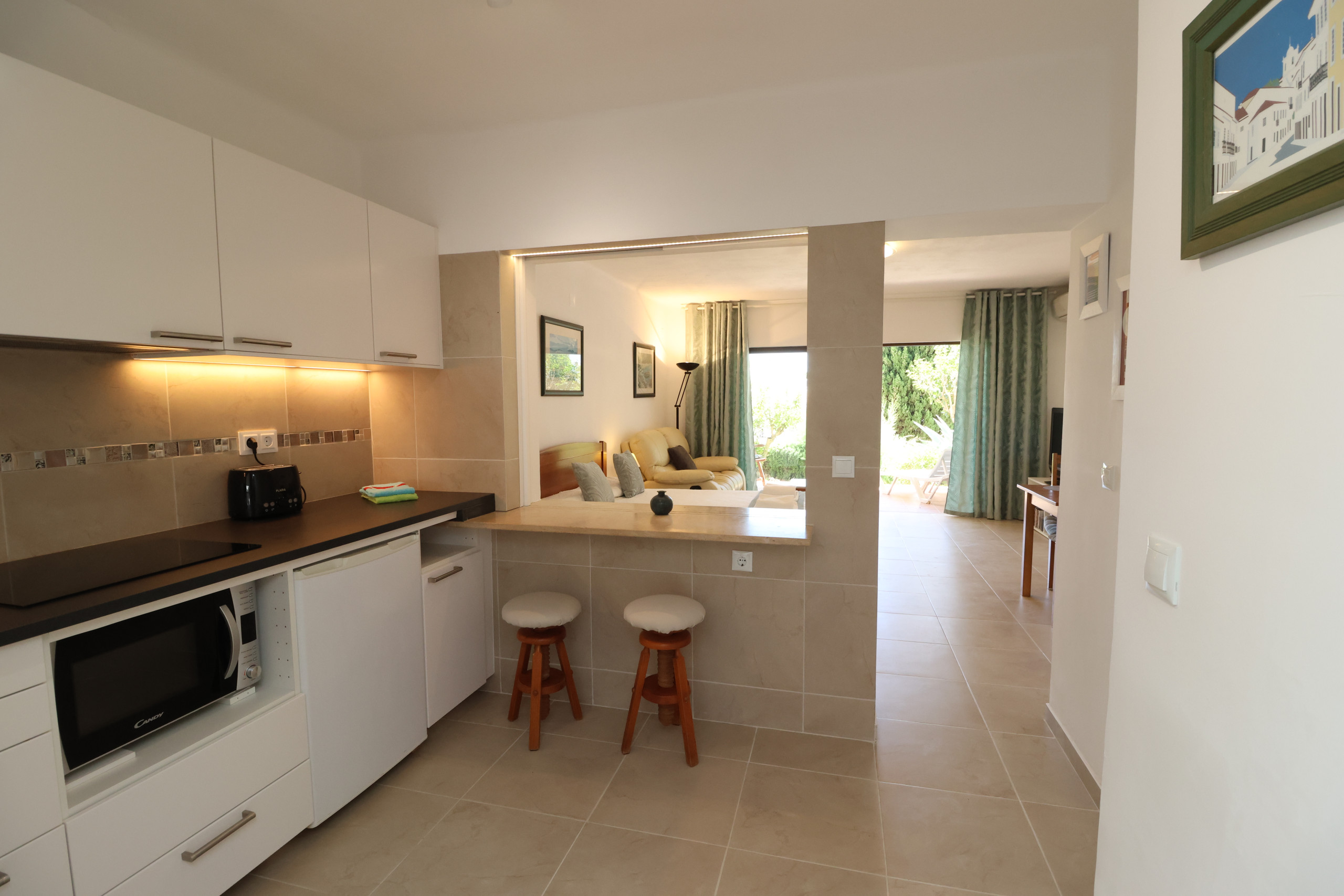 O apartamento é composto por: Hall de entrada; Sala / Quarto equipado com ar condicionado, cama de casal, um sofá de 2 lugares, TV(canais portugueses), mesa de jantar com 4 cadeiras; Varanda com vista para o jardim e equipada com uma mesa em madeira e 4 cadeiras; Cozinha equipada com Placa a gas, Frigorífico pequeno com congelador, Micro-ondas, Máquina de Café, Chaleira eléctrica e Torradeira; Casa de banho com chuveiro, equipada com secador de cabelo e tomada.
